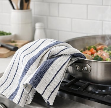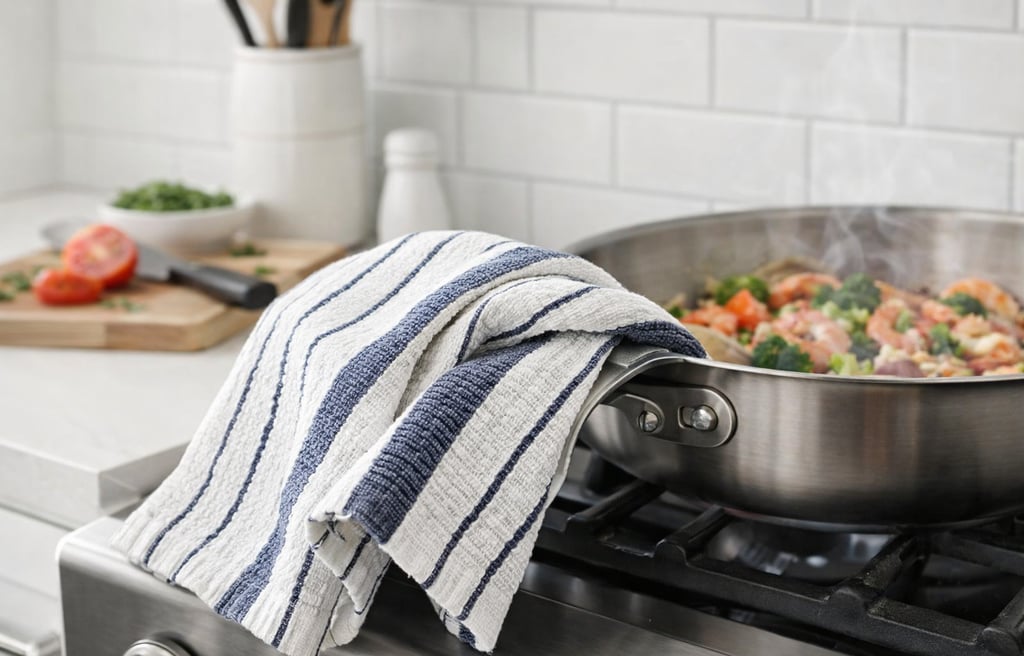 The Navy Blue stripes were our favorite aesthetically. They hide stains better and feel more forgiving in a real family kitchen. The Claret Red version looks beautiful too, but it definitely shows wear faster if you’re hard on your dishcloths.