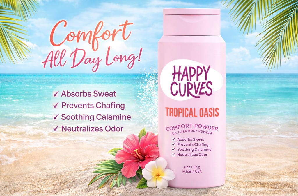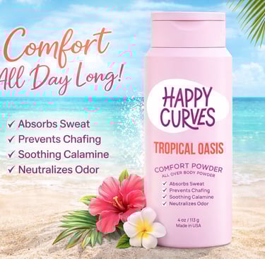 I’ve used HAPPY CURVES Comfort Powder (Talc-Free, Tropical Oasis) for over a month, basically every workday, and it’s been a genuinely helpful “quiet hero” product for inner thigh chafing and staying dry/comfortable through the day. The texture is silky, light, and non-greasy, the scent is soft and pleasant, and for me it lasts about 6–8 hours before I feel like I’d want a refresh.